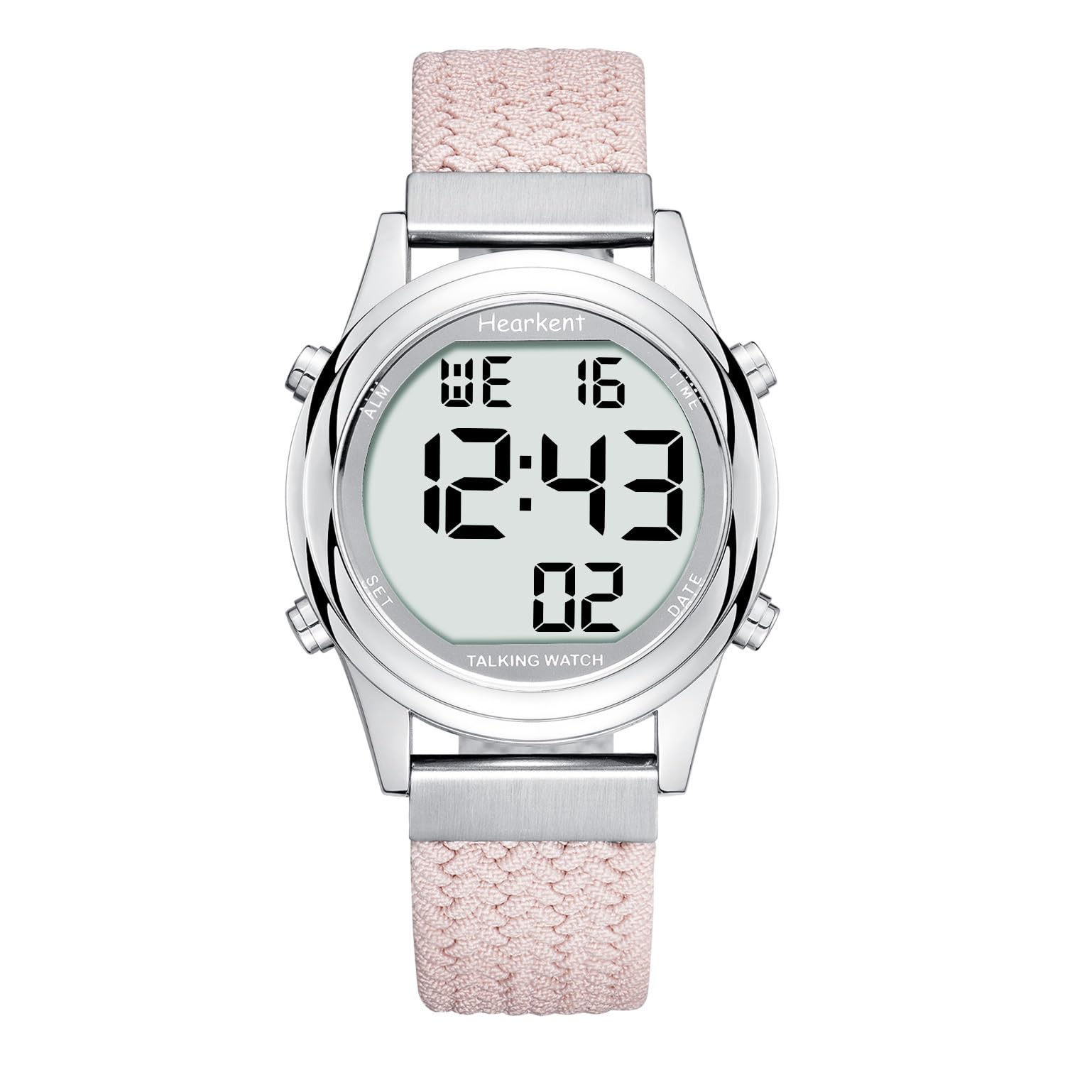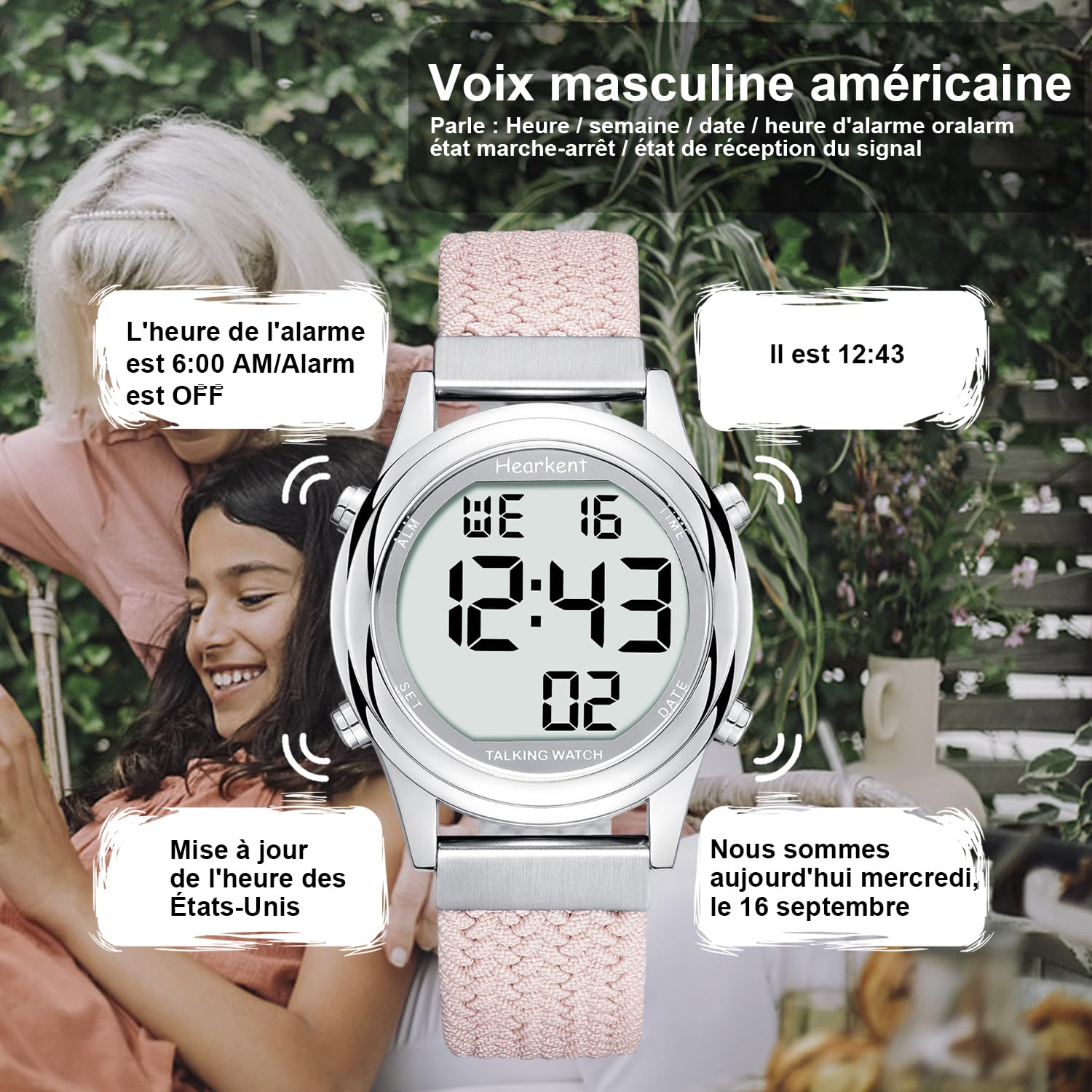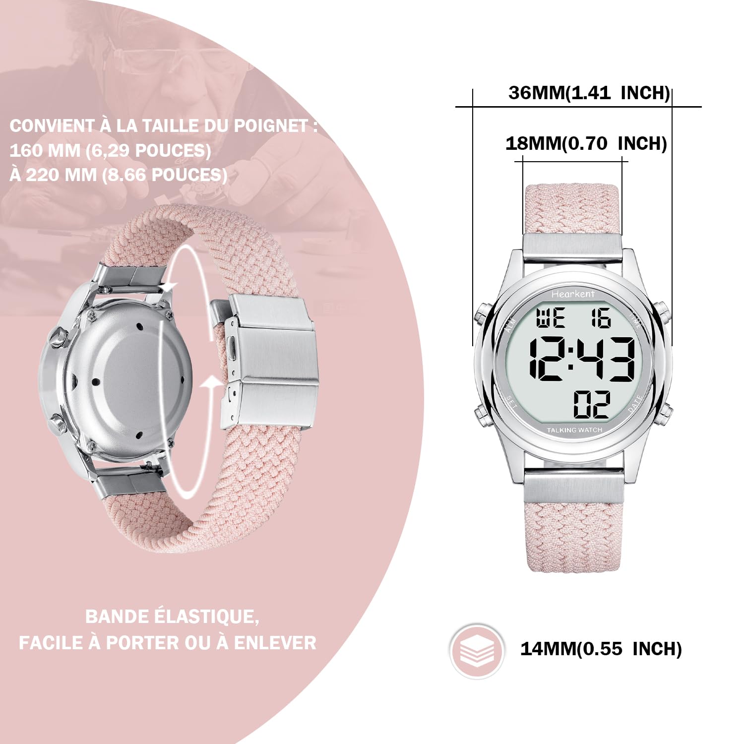 Digitaalne rääkiv käekell naistele, prantsuse keelne, suurte numbritega LCD-ekraan, nägemispuudega, eakatele või pimedatele, roosa