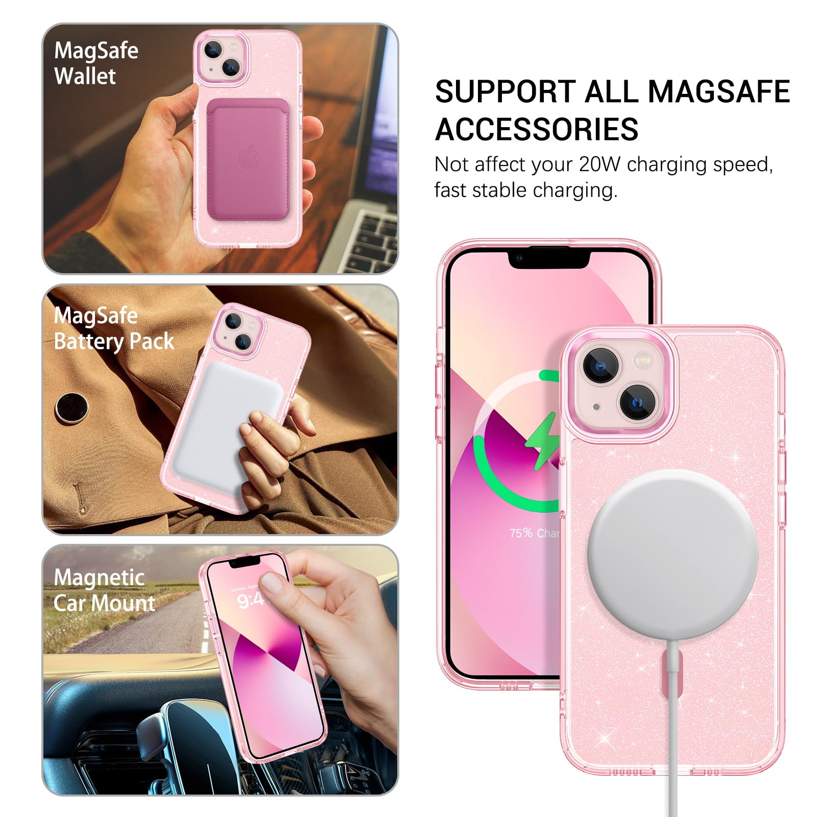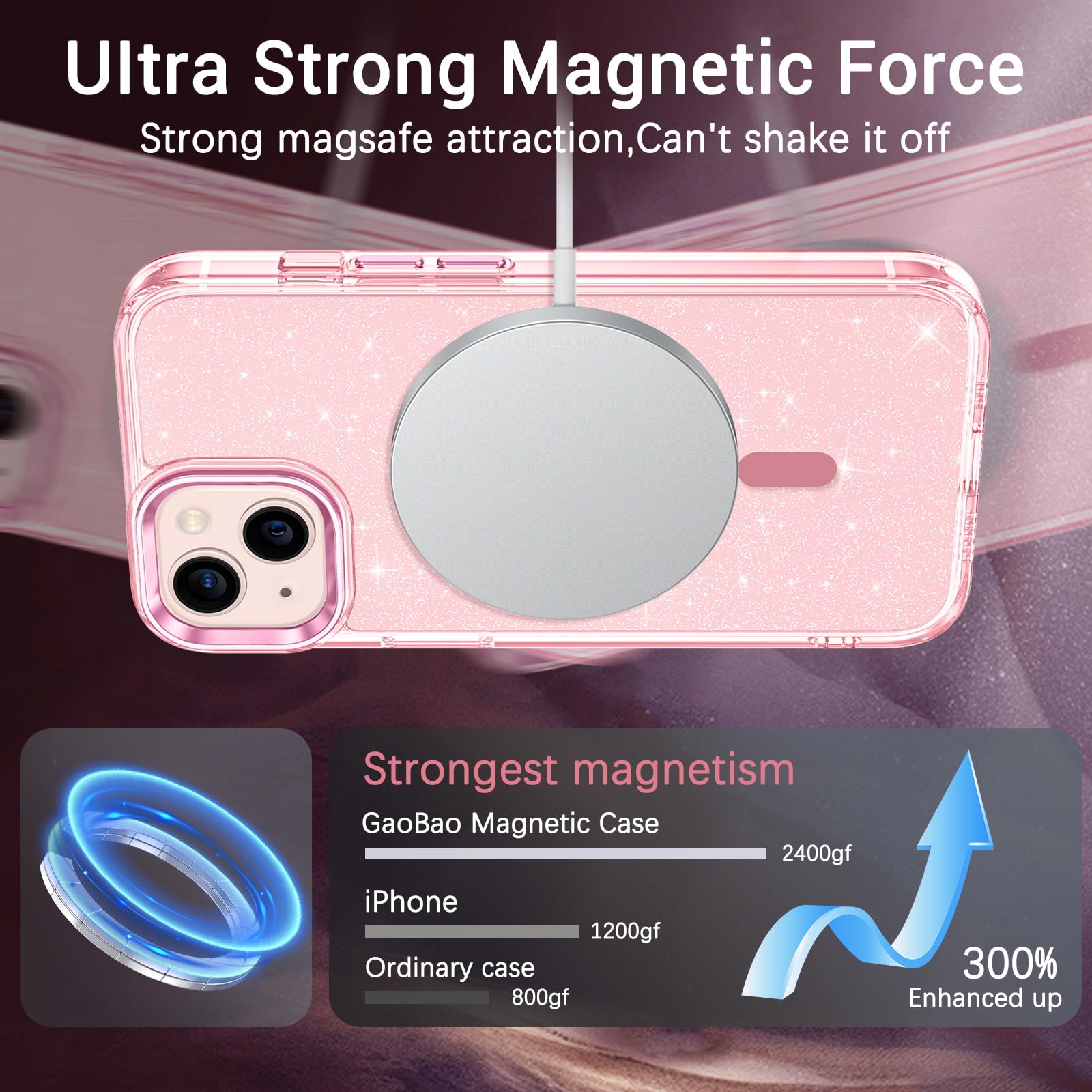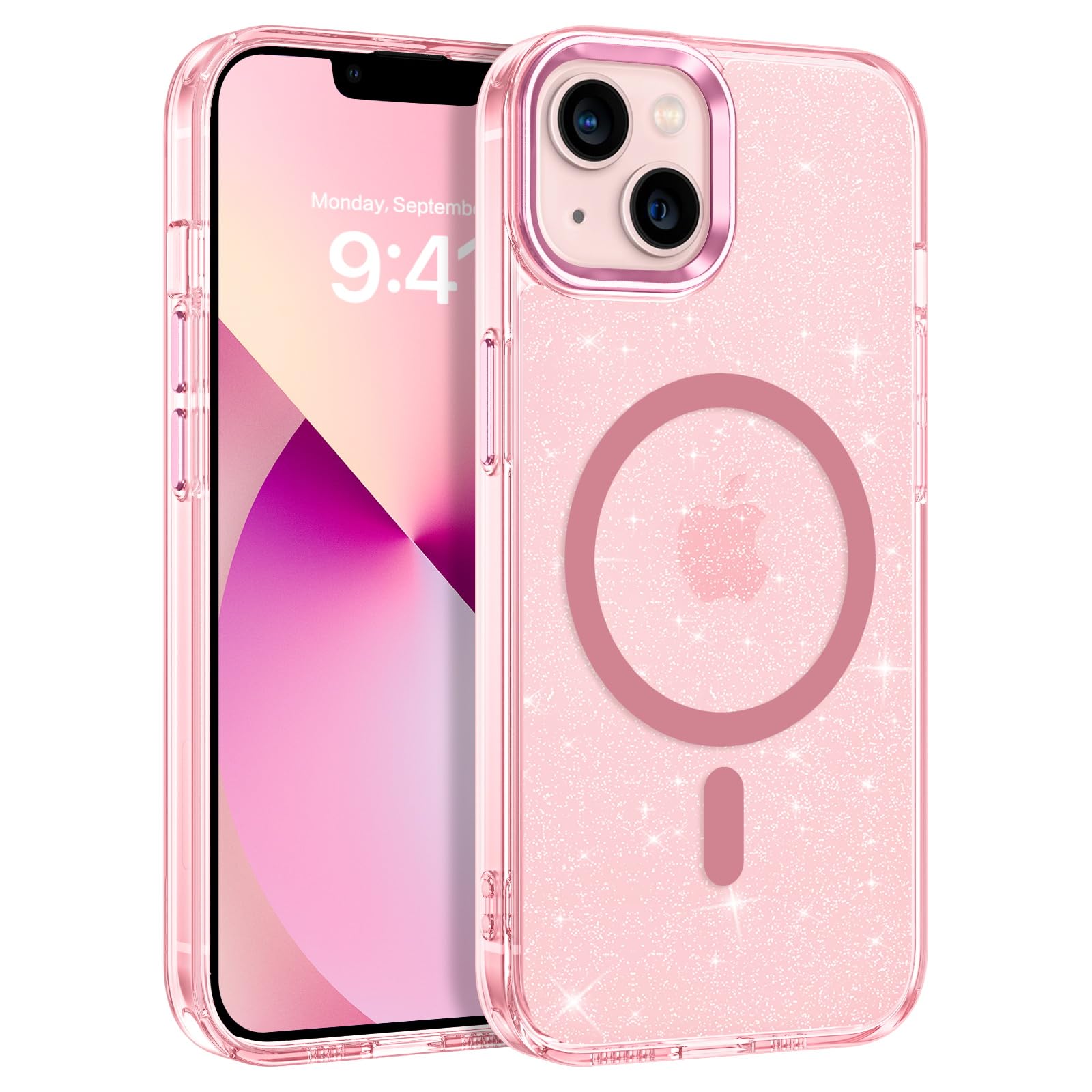 iPhone 13/14 telefonikaaned, MagSafe, läbipaistvad, roosa sädelusega