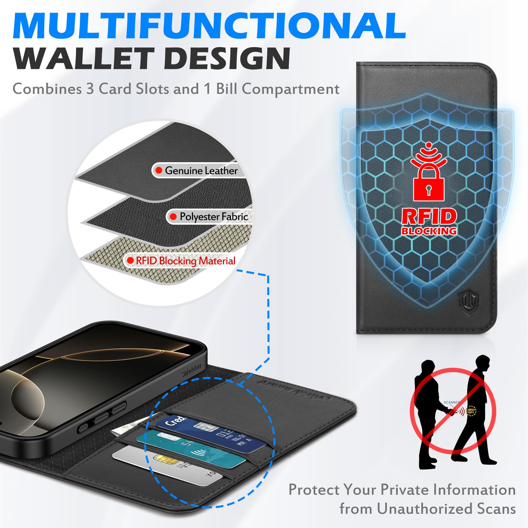 iPhone 16 Pro Max telefonikaaned, nahast, RFID-kaitsega, must (17.5cm)