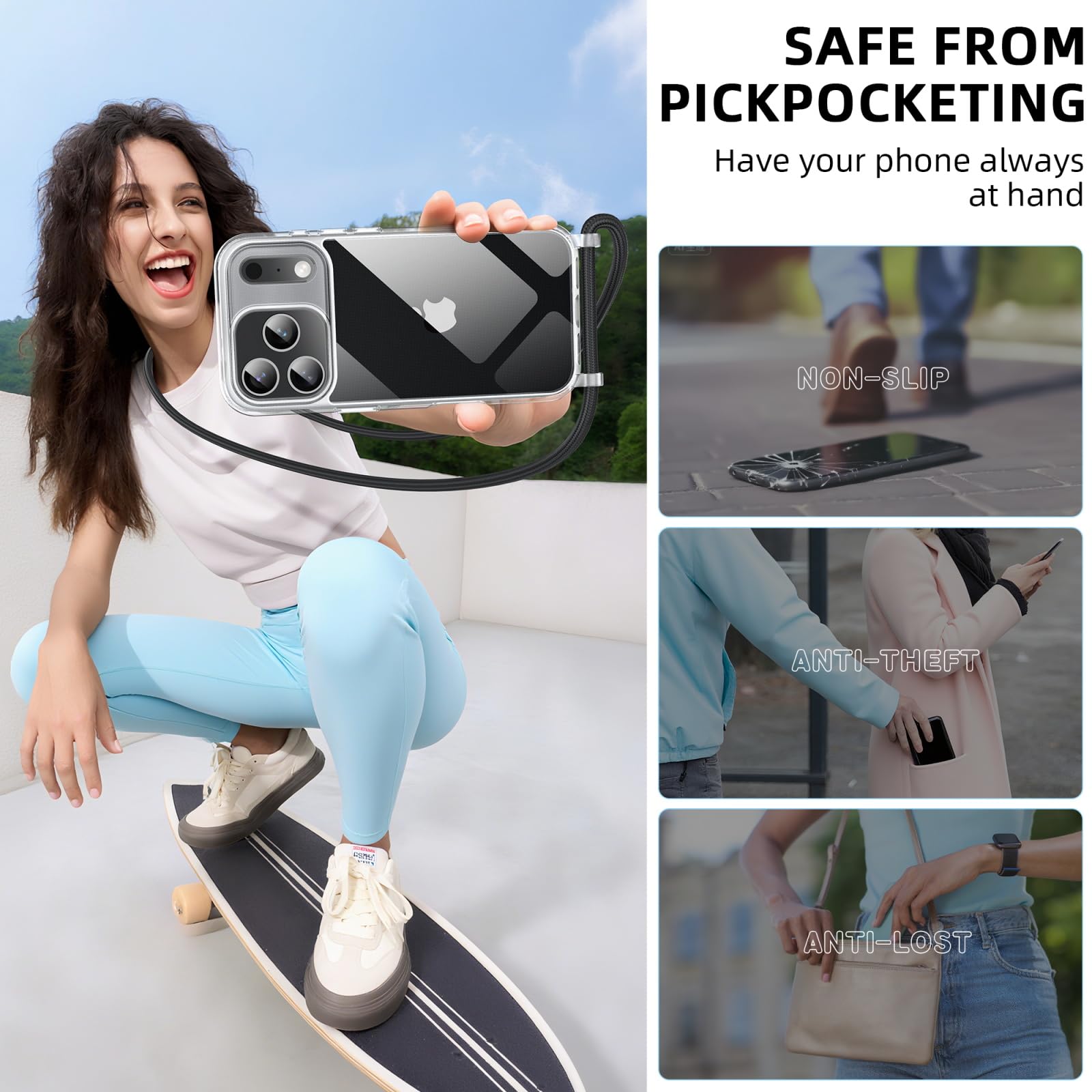 iPhone 17 Pro telefonikaaned, rihmaga, kaamera- ja ekraanikaitsega, läbipaistev must (16cm)