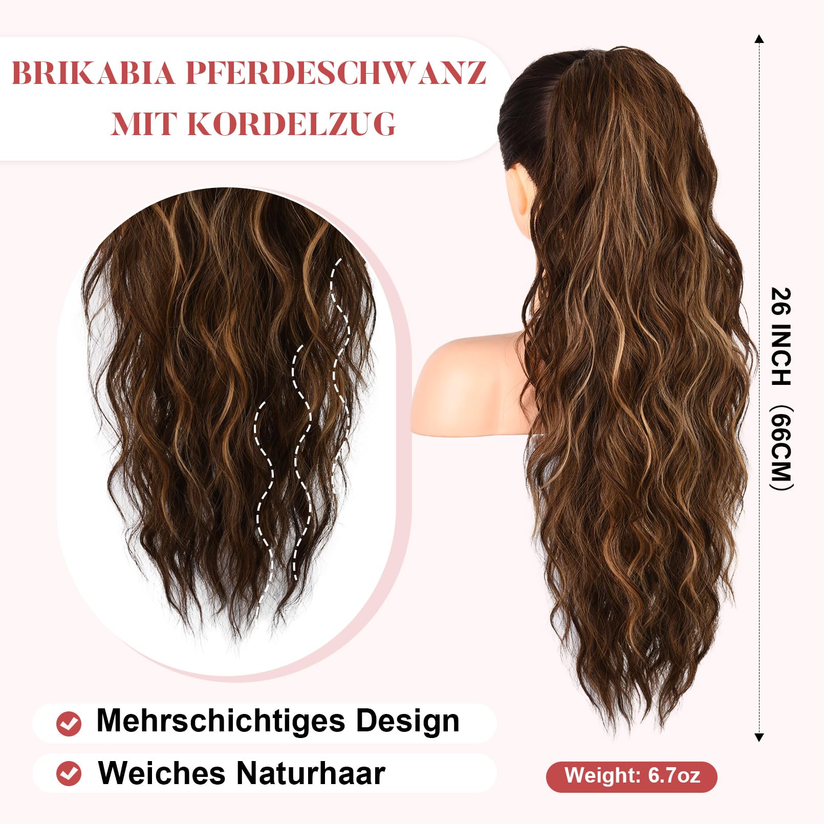 Laineline pikk pats kummi ja clip in kinnitusega, kastanpruun (66cm)