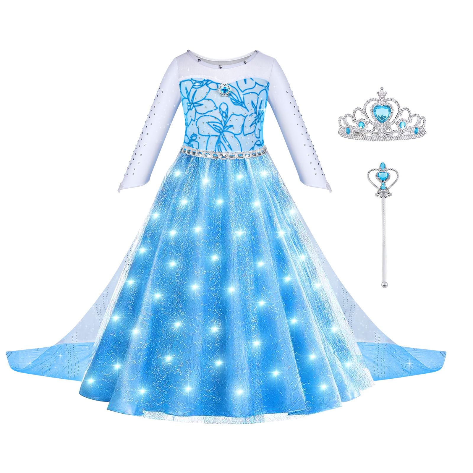 LED-valgustusega printsessi kleit, kroon ja võlukepp (universaalne suurus)