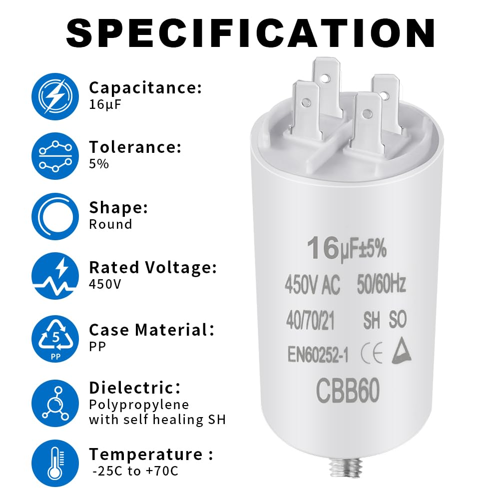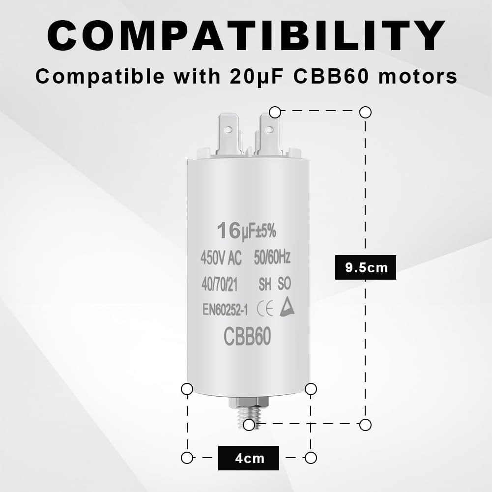 Mootori käivituskondensaator CBB60 (16μF, 450V)