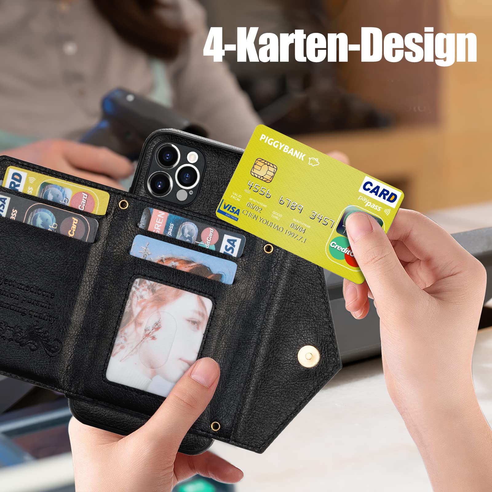 Nahast iPhone 16 Pro telefonikaaned, rihmaga, lukuga, 4 kaardipesaga, must kogus