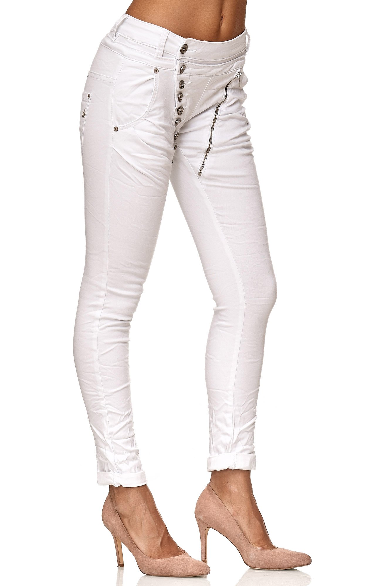 Naiste hästi venivad boyfriend teksad, avaralõikelised, nööpidega, valged (s. 7XL, puus kuni 140 cm)