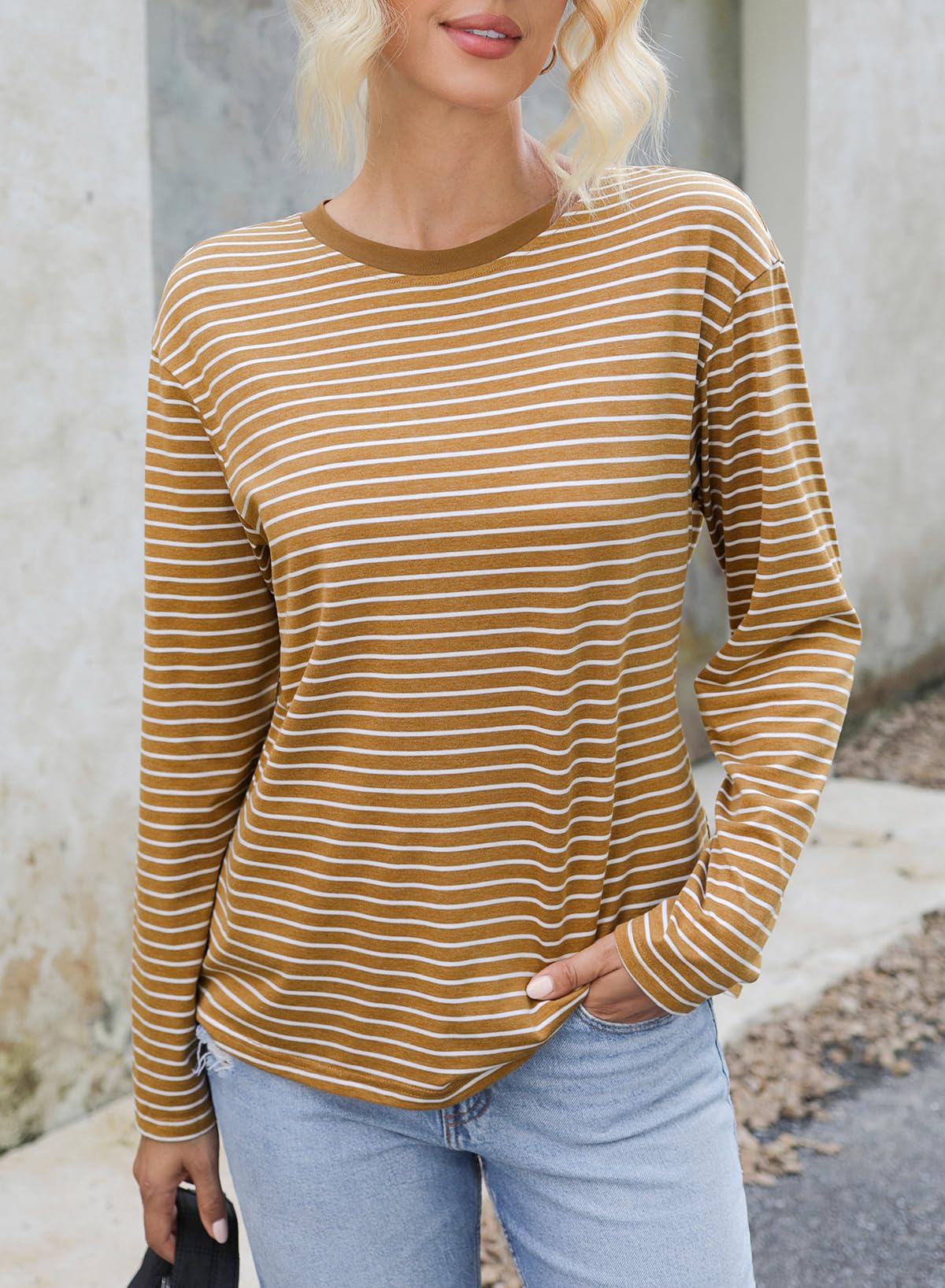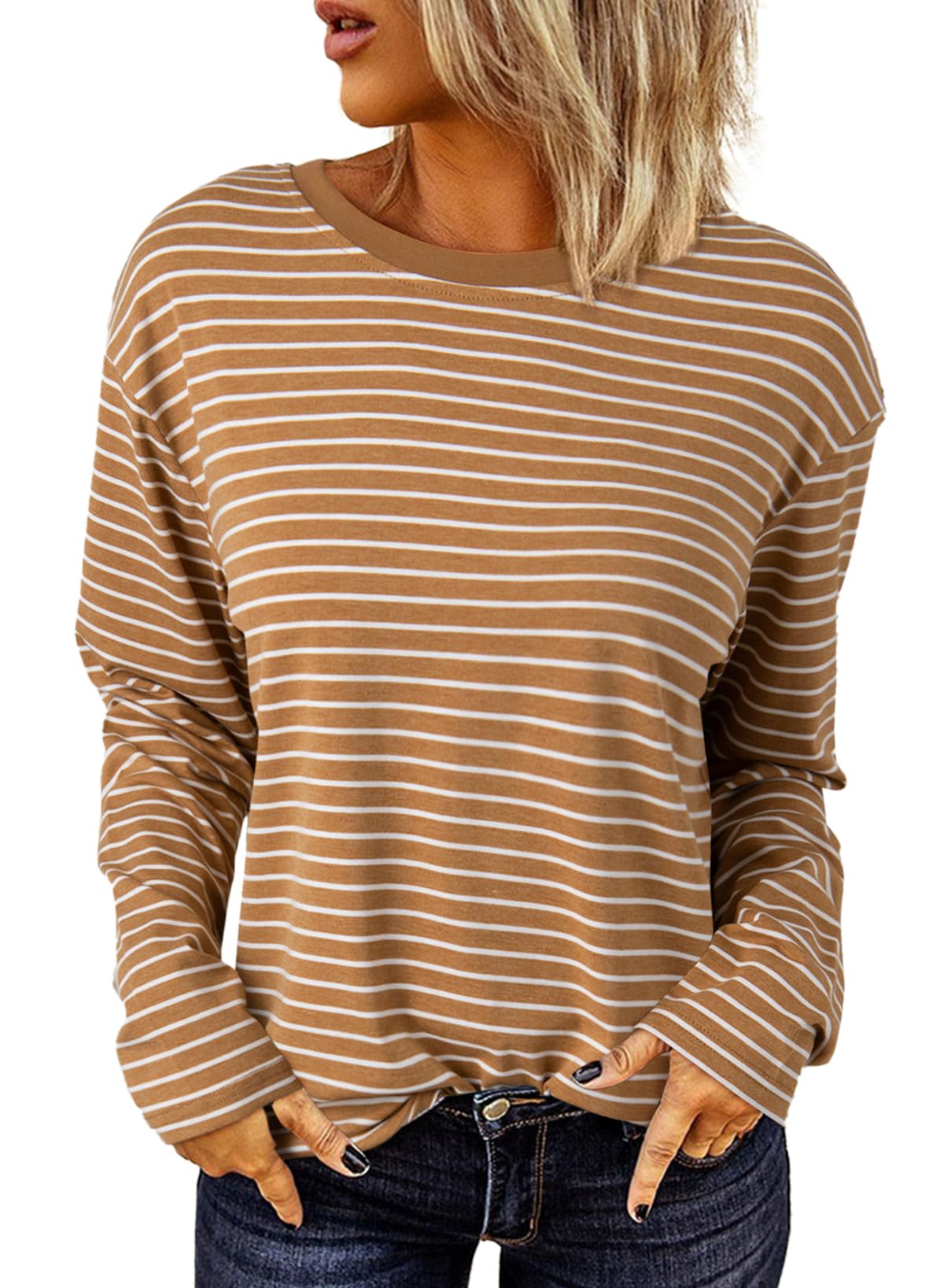 Women’s Striped Long-Sleeve Round Neck T-Shirt Casual Basic – Khaki S