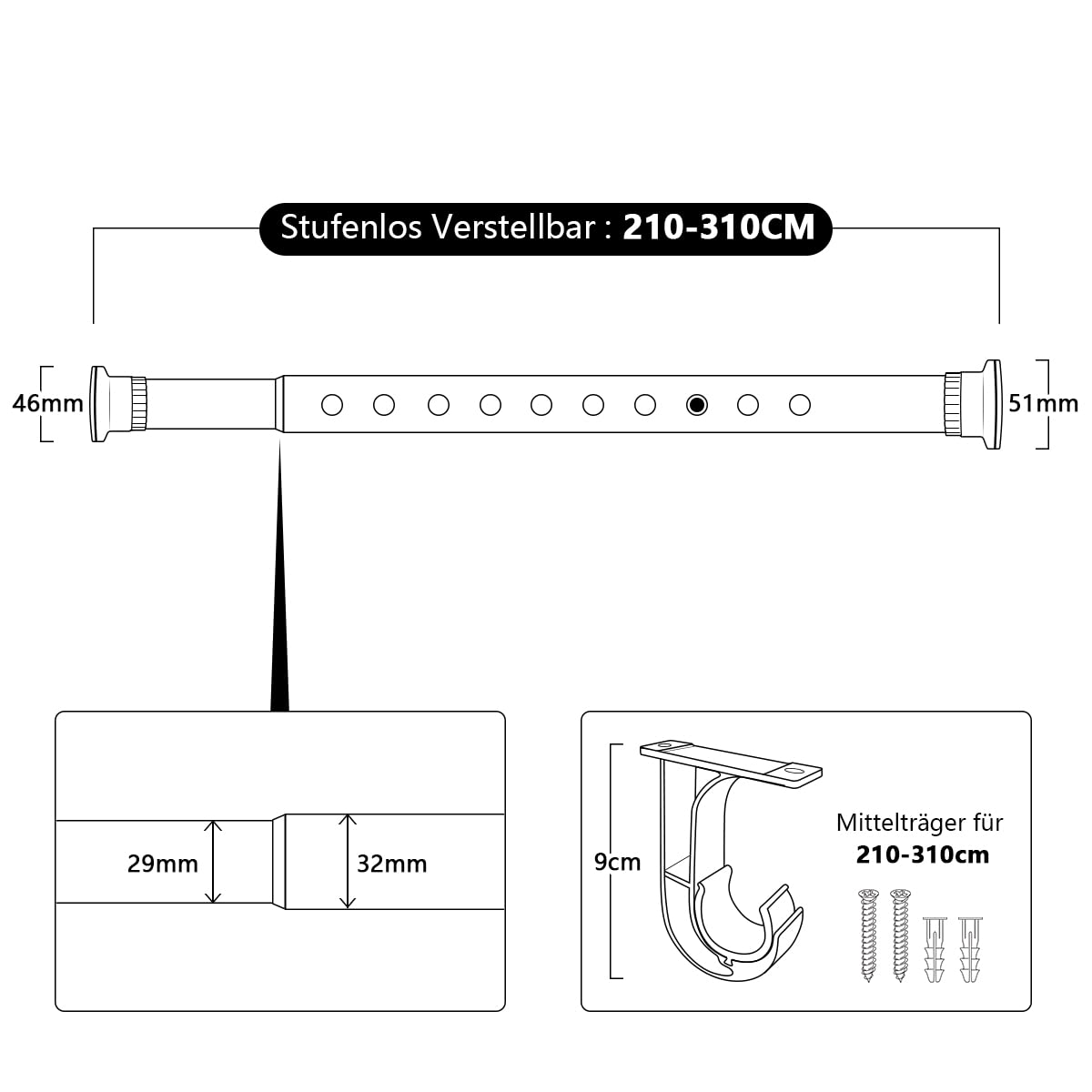 Pikendatav kardinapuu, must (210-310cm), pingega kinnitatav