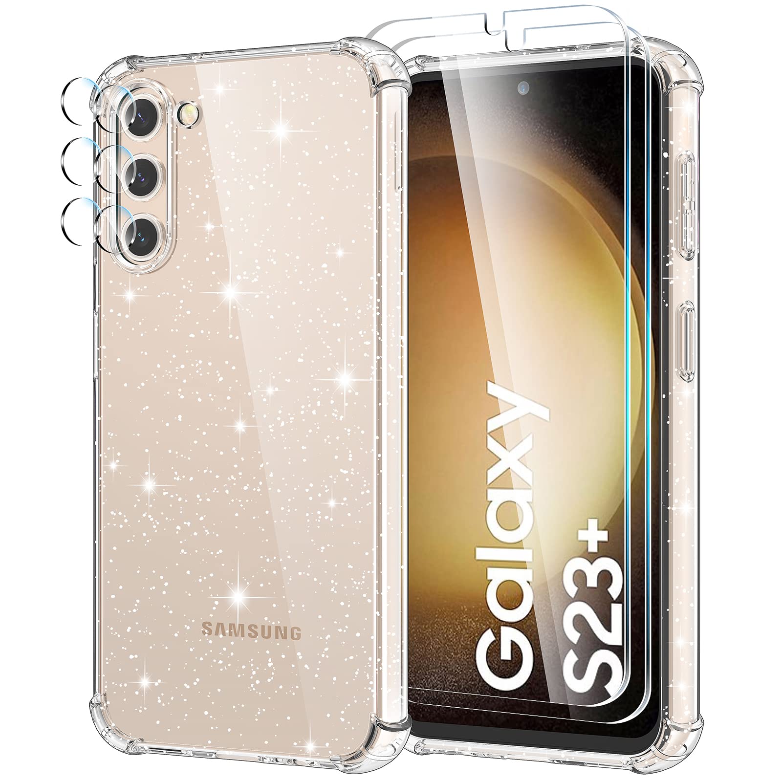 Samsung Galaxy S23 Plus telefonikaaned, löögikindel, läbipaistev, sädelev (2 ekraanikaitsega) kogus
