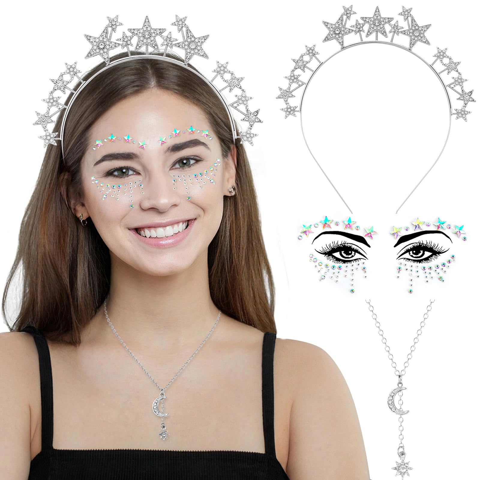 Tähtedega sädelev peavõru koos näokleepsude ja kaelakeega