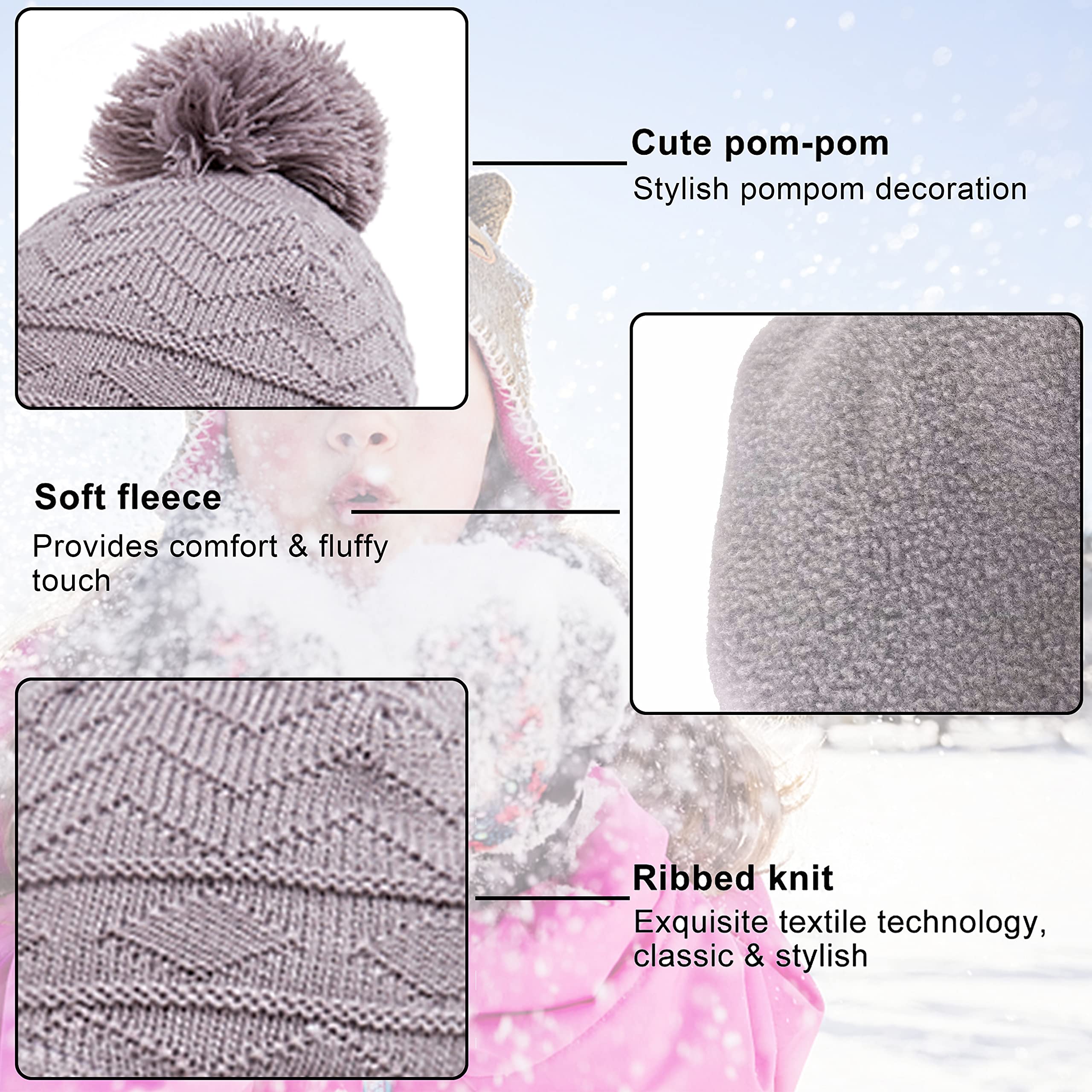 Kids Hat Scarf Gloves Set Knit Pom-Pom Lined Winter Snood Beanie – Grey S